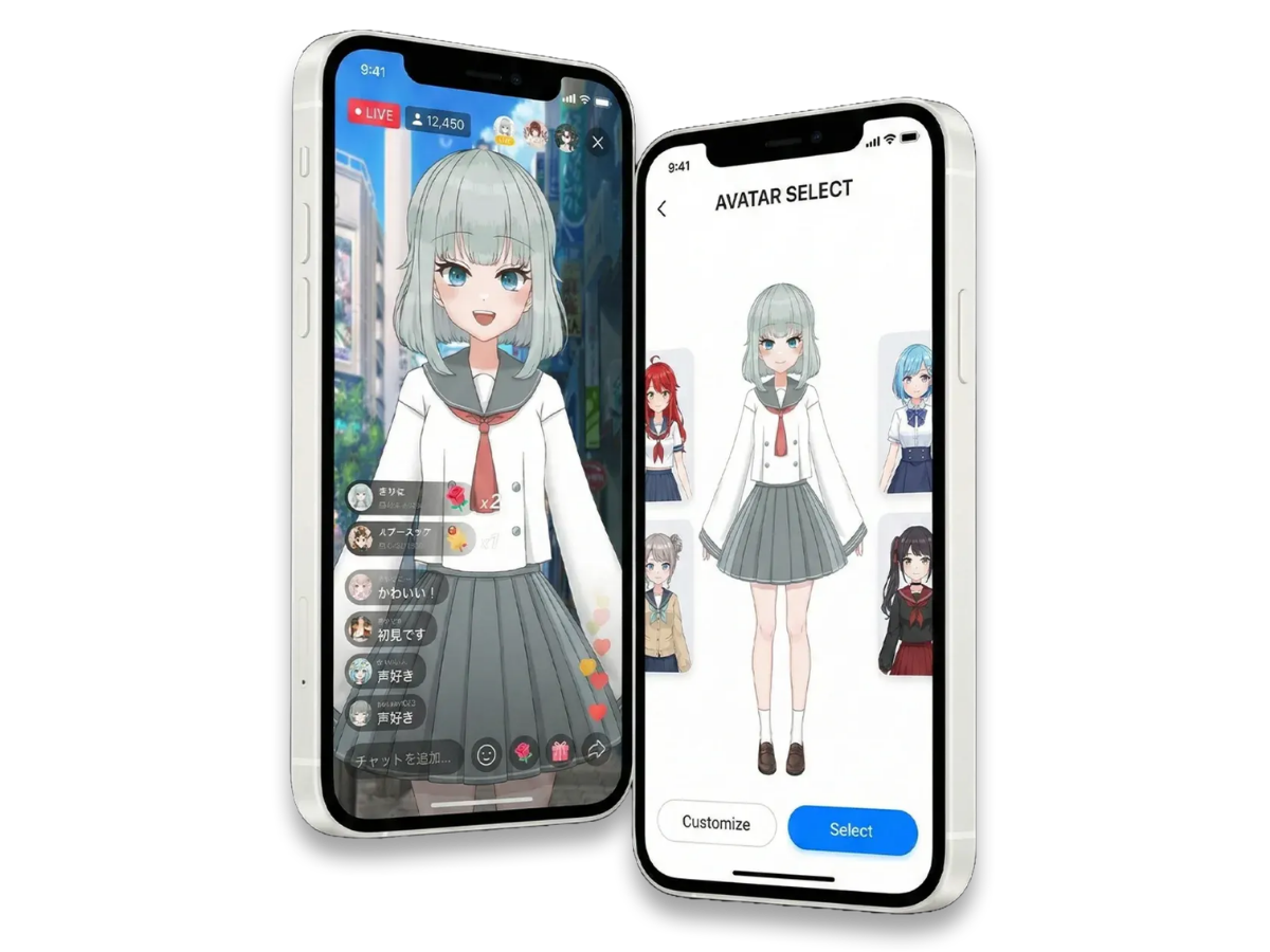 アバター配信とリアル配信を自由に切り替え可能。気分やシーンに合わせて選べます。